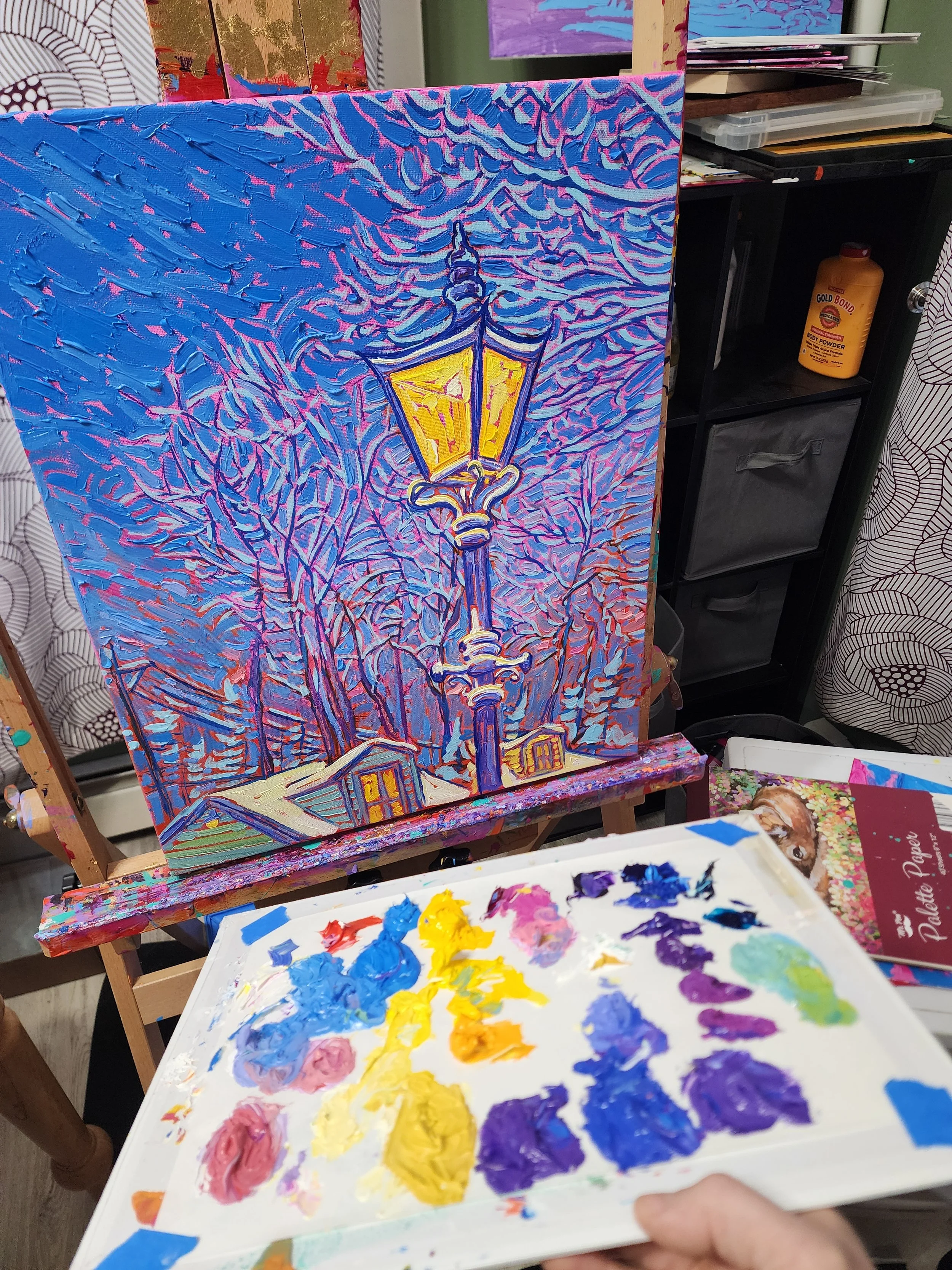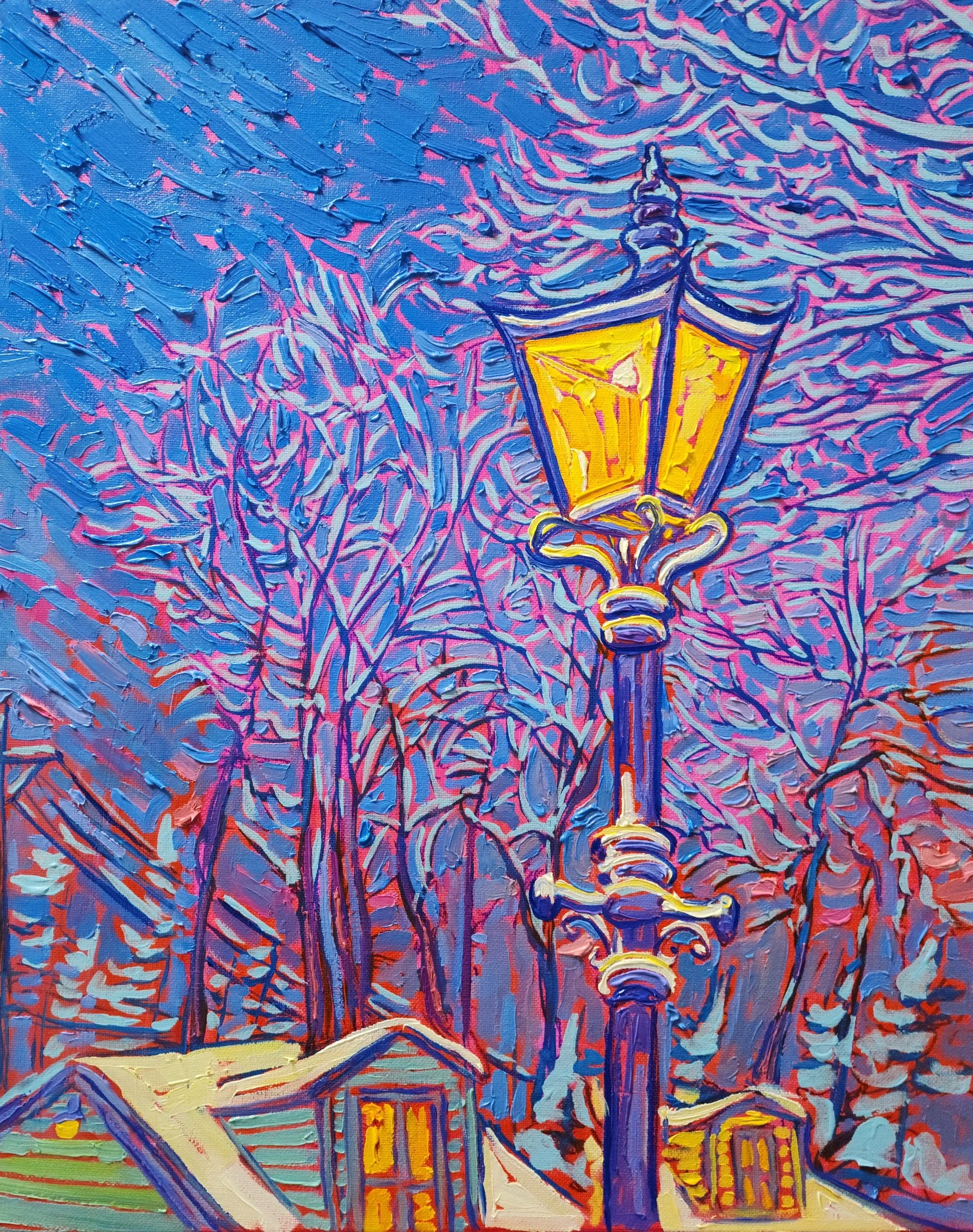 The snow’s been back in the neighborhood in a big way here in Kittery. I painted this small 16Wx20H while watching the snow fall outside the window today. Anyone that’s walked in an empty neighborhood following a snow storm can probably appreciate the quaint serene silence you feel as the snow illuminates the otherwise dark stillness. In scenes like this street lanterns have a lonely artful mystique about them that I find inspiring.